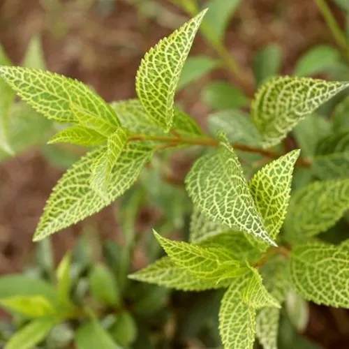 Листья форзиции Камсон ланцетные, с яркой темно-зеленой окраской и белыми жилками, образующими ажурную сеточку. Края листа зубчатые, что добавляет дополнительной изысканности в общую картину растения. Более того, данный сорт обладает пестролистностью, что делает его еще более привлекательным.