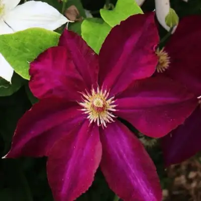 Клематис Мазовше отличается мощной силой роста. В высоту лиана достигает 3-3,5 м. Зацветает красивыми большими цветками в июне, цветение продолжается все лето. Бархатистые цветы диаметром 15-20 см, бордового цвета, состоят из 6 лепестков. Цветет обильно, если обеспечить ему хорошие условия выращивания. Растение выдерживает низкие температуры, проявляет стойкость к возбудителям заболеваний. Цепляется за опоры листовыми черешками. Годится для выращивания у ограждений, беседок, сеток, решеток и других садовых опор.