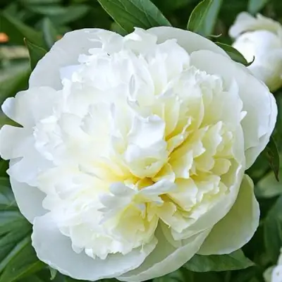 Цветки сорта Дюшес де Немур являются махровыми и шаровидными. Они имеют крупный размер, с диаметром 15-20 см. Окраска цветков белая с зеленовато-желтым оттенком у основания лепестков, по мере роспуска становится более белой. Интересен факт, что цветки могут быть двухцветными. Насыщенность цвета светлая. Общая форма лепестков наружная - широкая, цельнокрайняя, овально-вогнутая, внутренние лепестки более узкие. Махровая структура цветов создает эффект плоского, анемоновидного и рыхлого цветения. Аромат цветов тонкий и сладкий, напоминающий запах ландыша. Срезанные цветки саженцев пиона Дюшес де Немур сохраняют свежесть в течение 5-6 дней.