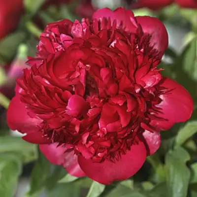 Этот сорт пиона привлекает внимание плотными прямостоячими стеблями и зелеными прочными листьями. Высота растения составляет примерно 75 см, делая его подходящим как для одиночных, так и для групповых посадок. Цветок среднего размера, диаметром 18 см, радует глаз насыщенно-красной окраской с ярким оттенком и шелковисто-бархатными лепестками бомбовидной формы.