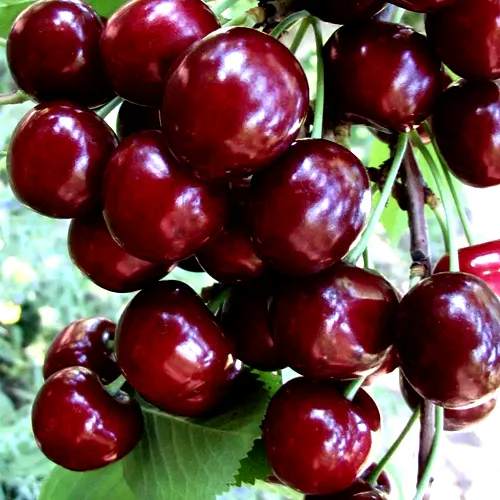 Плоды черешни Оленька отличаются крупными размерами, их средняя масса достигает 7,3 граммов. Высота плода составляет 24 мм, ширина – 22 мм, толщина – 20 мм. Форма плода варьируется от тупосердцевидной до сердцевидной с легким сжатием по бокам. Особенно внимание стоит уделить окраске: в процессе полного созревания плоды становятся почти черными, их темно-красная кожица обладает приятным блеском.