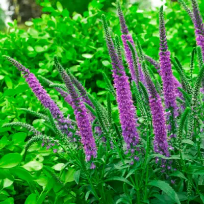 Вероника Фест Матч характеризуется прямостоячей формой куста с высотой до 60 см и шириной 30-40 см, что делает её идеальным партнером для различных композиционных решений в саду. Её привлекательность заключается в ярких пурпурных колосовидных соцветиях, которые плотно собраны и впечатляют насыщенностью цвета. Листья растения тёмно-зелёного оттенка создают выразительный контраст, подчеркивающий красоту цветков.