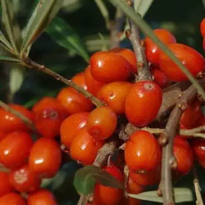Саженцы облепихи Воробьевская отличаются мощными побегами серого цвета, которые прикрыты колючками, обеспечивающими защиту растения. Кора саженцев имеет серовато-светло-коричневый оттенок, который придает растению неповторимый шарм. Листья крупные, темно-зеленые сверху и серебристо-зеленые снизу, широколанцетной формы, что делает куст визуально привлекательным.