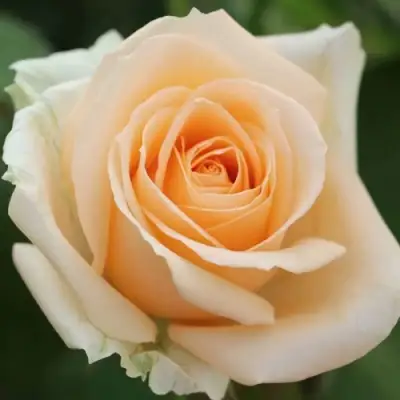 Цветки крупные — 8–10 см в диаметре, с высокой центральной чашей и правильной формой лепестков. Бутоны распускаются медленно, демонстрируя плавные переходы оттенков от кремово-белого основания к мягкому персиковому центру. Внешние лепестки могут иметь почти фарфоровую белизну, подчёркивая глубину окраса сердцевины. Махровость умеренная: от 17 до 25 лепестков. Аромат слабый, нейтральный — не конкурирует с другими запахами, но сохраняет лёгкие нотки классической розы.