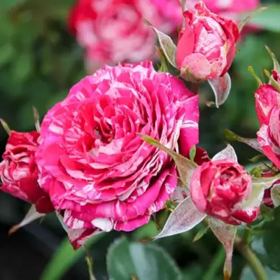 Цветение — главный козырь сорта. С конца мая и до октября куст выпускает многочисленные кисти, в каждой из которых распускаются до 10 мелких бутонов. Цветки махровые (20–30 лепестков), диаметром 3–4 см. Уникальность Арроу Фолиес — в окрасе: каждый бутон индивидуален. На лепестках чередуются малиново-красные и бело-розовые полосы, штрихи и разводы. Рисунок варьируется, что делает каждое цветение визуально неповторимым. Аромат легкий, с фруктовой ноткой, не доминирующий, но улавливаемый на близком расстоянии.