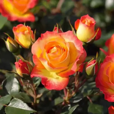 Цветение начинается в июне и продолжается до октября. Бутоны формируются кистями по 5–10 штук, открываются неравномерно, создавая динамичную визуальную массу. Цветки диаметром 5–6 см, густомахровые, с 25–35 лепестками. Оттенок — насыщенный микс оранжевого, малинового, кораллового и абрикосового — меняется в зависимости от фазы цветения и освещения. Каждый цветок уникален. Это даёт кусту живой градиент даже в пределах одного соцветия.
